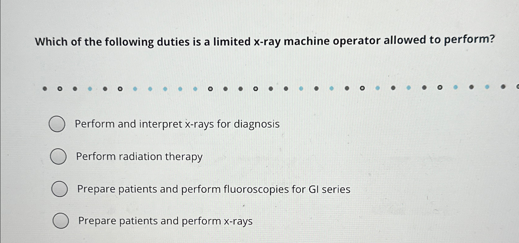 Solved Which of the following duties is a limited xray Limited X Ray Machine Operator Exam which of the following are considered duties of a limited operator? these courses are designed to assist students that need to take and pass the arrt limited scope of practice in. Determine what examination should be performed. the american registry of radiologic technologists (arrt) administers the limited scope of practice in radiography examination. written by the. Limited X Ray Machine Operator Exam.